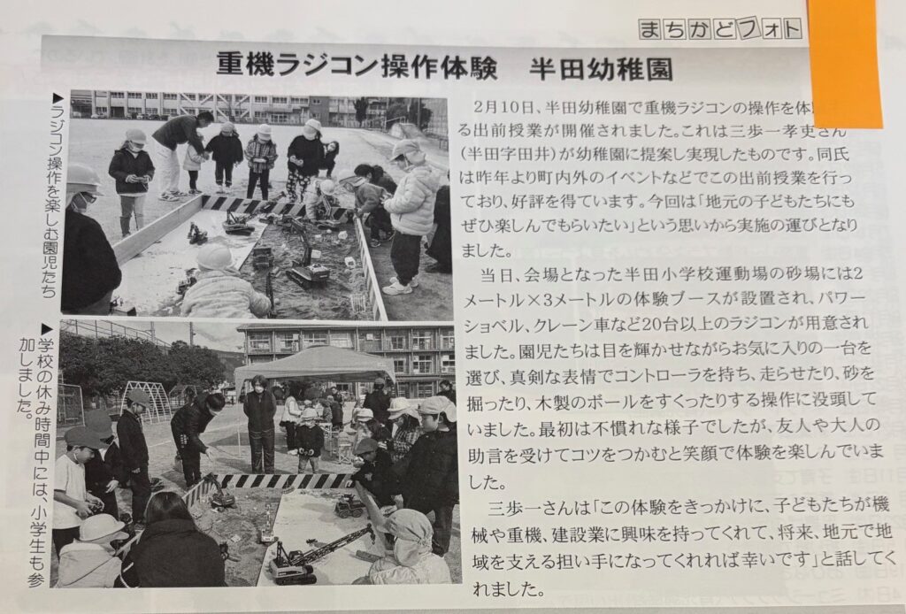 2/10(火)に、半田幼稚園で重機ラジコンの出前授業の記事を広報つるぎに掲載していただきました!